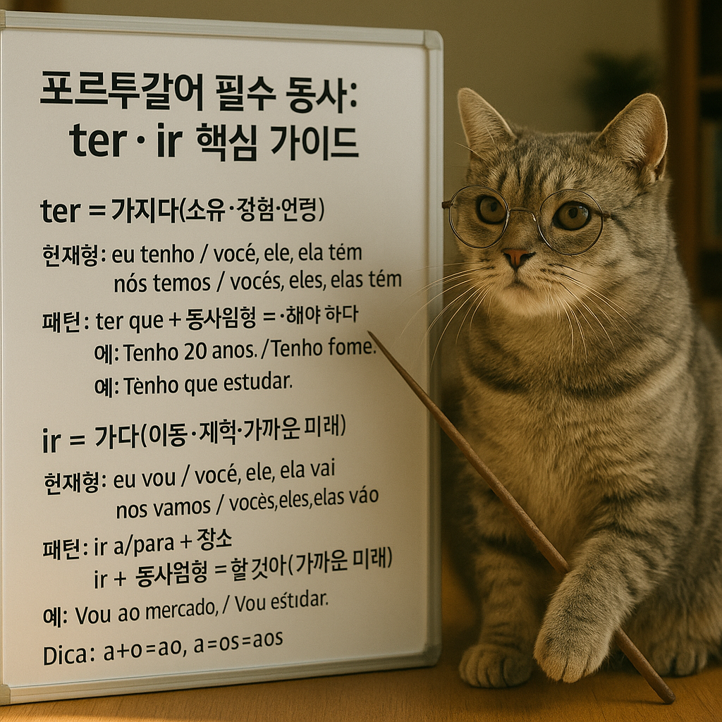 포르투갈어에서 ter와 ir은 회화의 뼈대예요. ter는 소유와 의무, 존재 느낌을 만들고, ir은 이동과 계획, 가까운 미래를 말하게 해줘요. 두 동사만 익혀도 일상 대화가 훅 열려요.